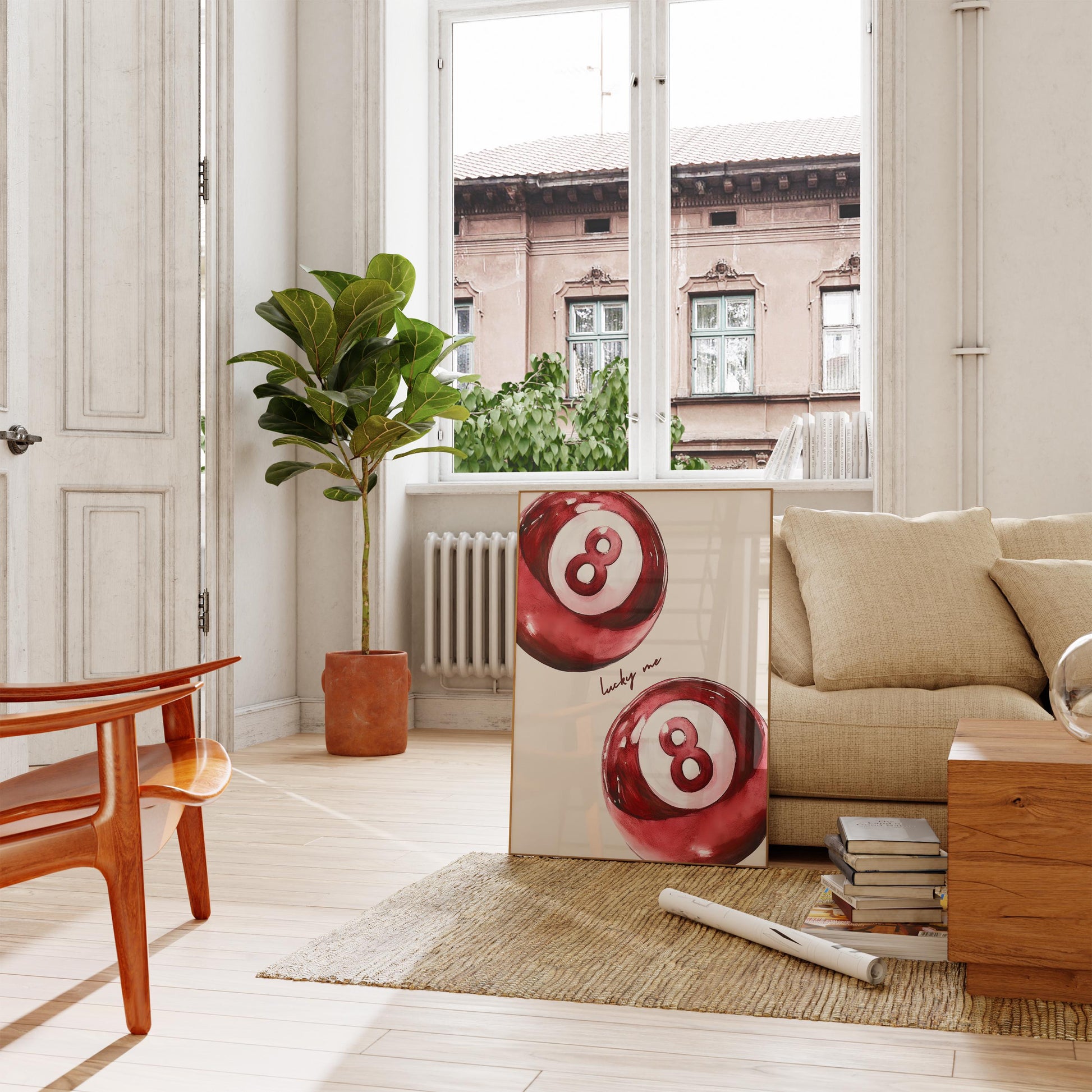 Aesthetic watercolor style 8 pool ball print in a cherry red colour