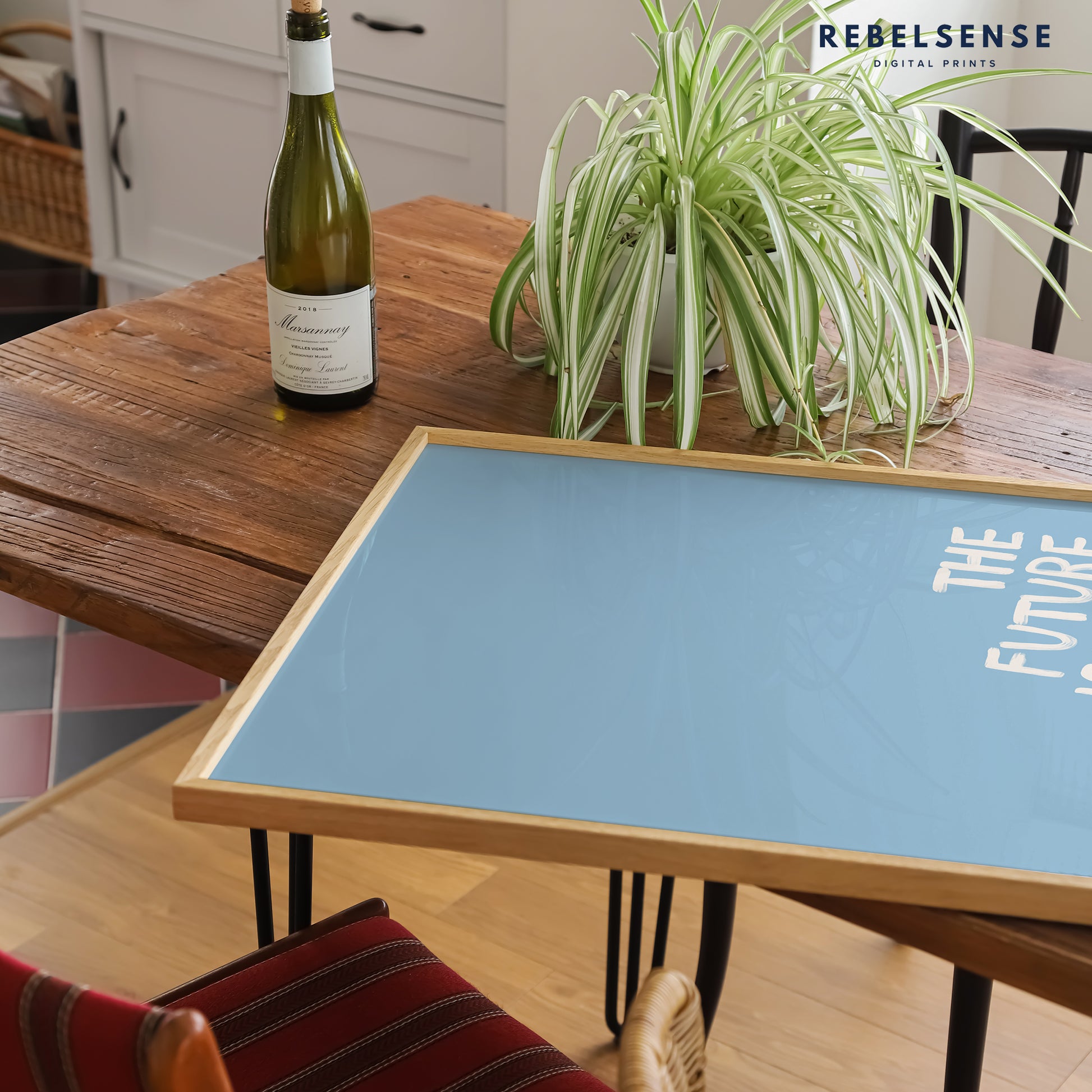 Contemporary print on a light blue background featuring the quote "The Future Is Yours To Create" in a textured brush stroke font