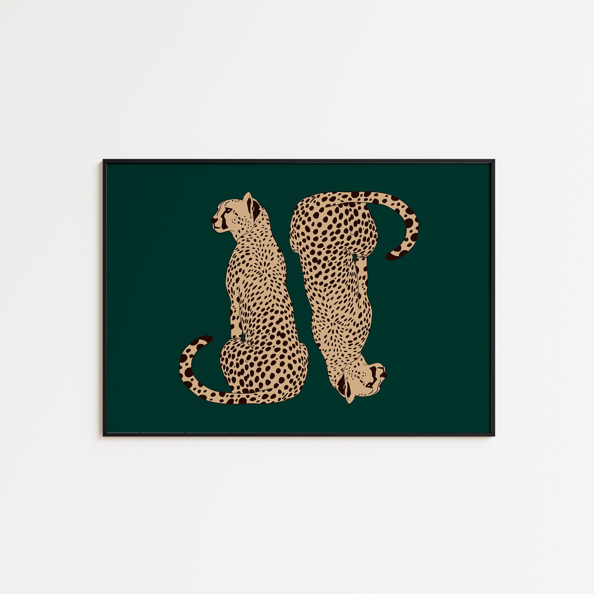 Hand drawn cheetahs in a symmetrical design with emerald green background