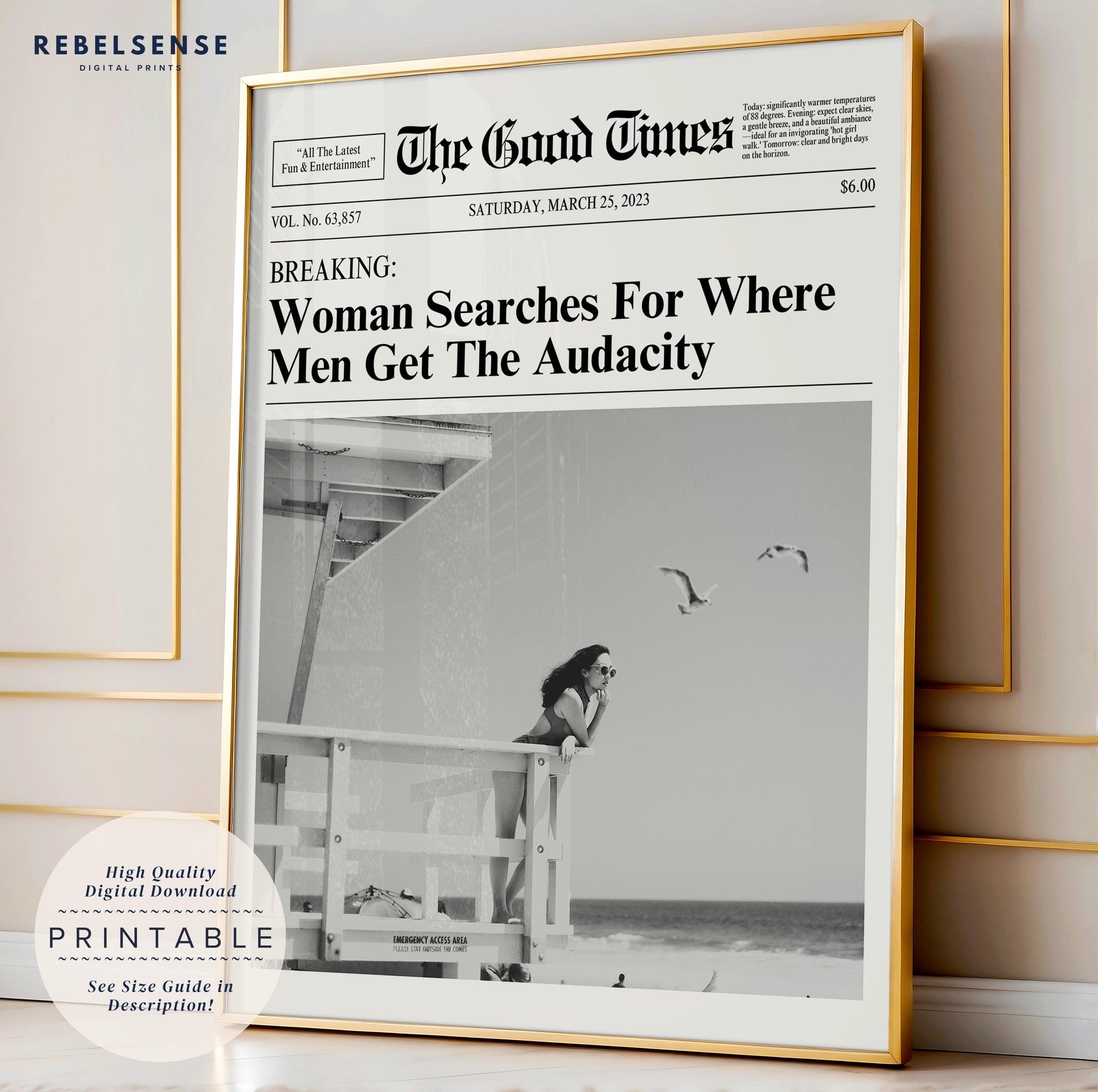 Make waves with our trendy newspaper wall art. This feminist, surf-inspired print is perfect for creating a trendy, preppy statement piece for your dorm or maximalist decor!