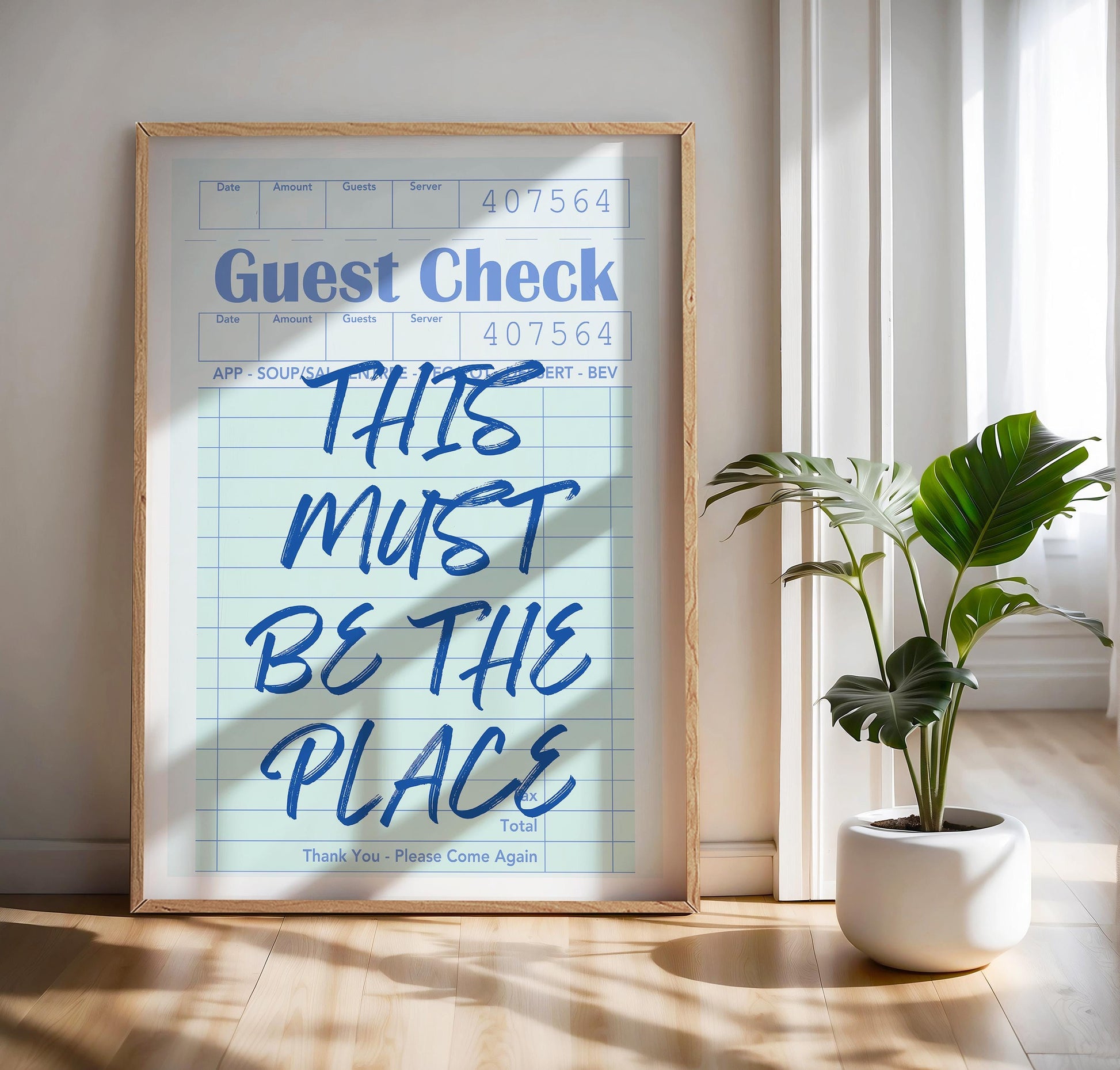 Light blue guest check print with "This Must Be The Place" quote