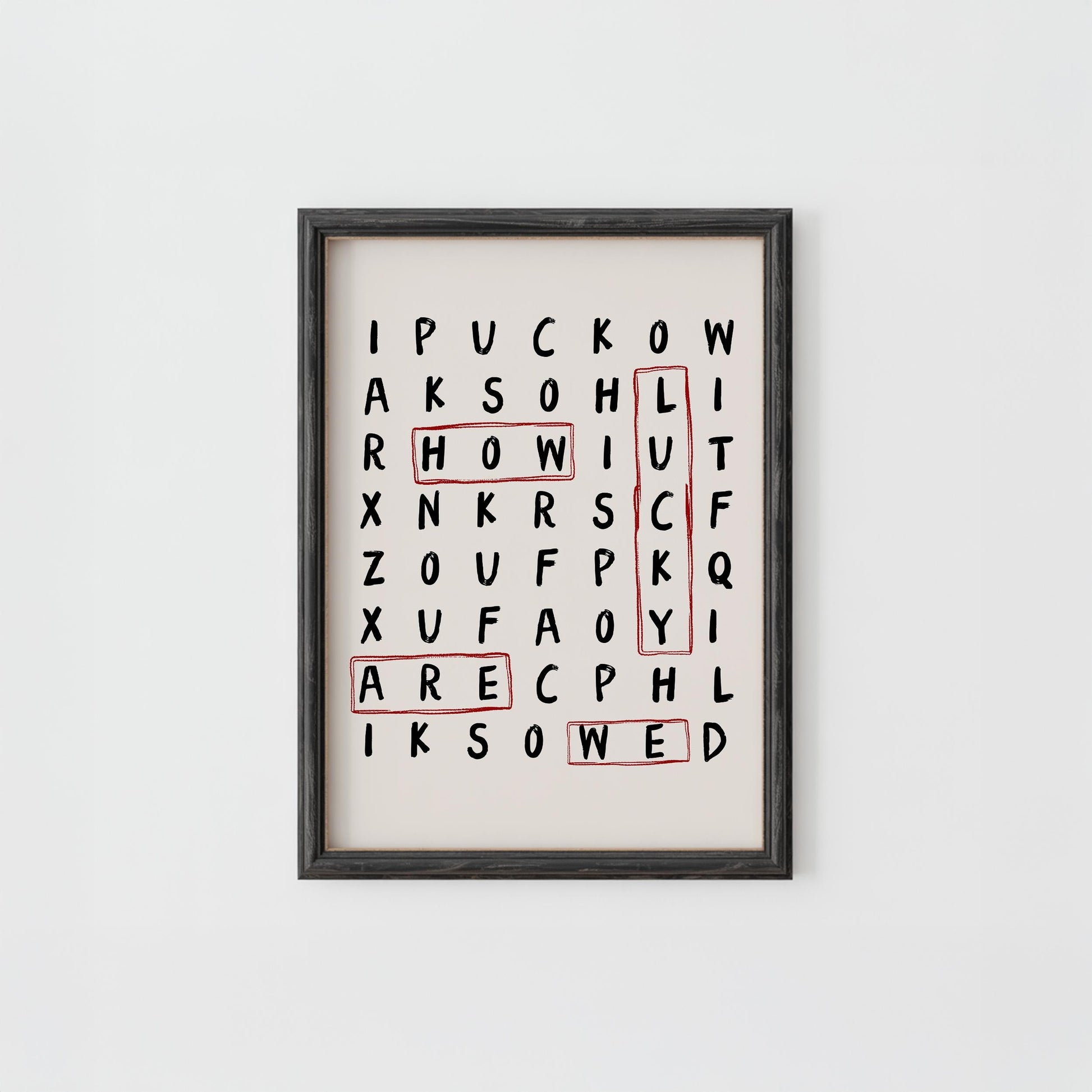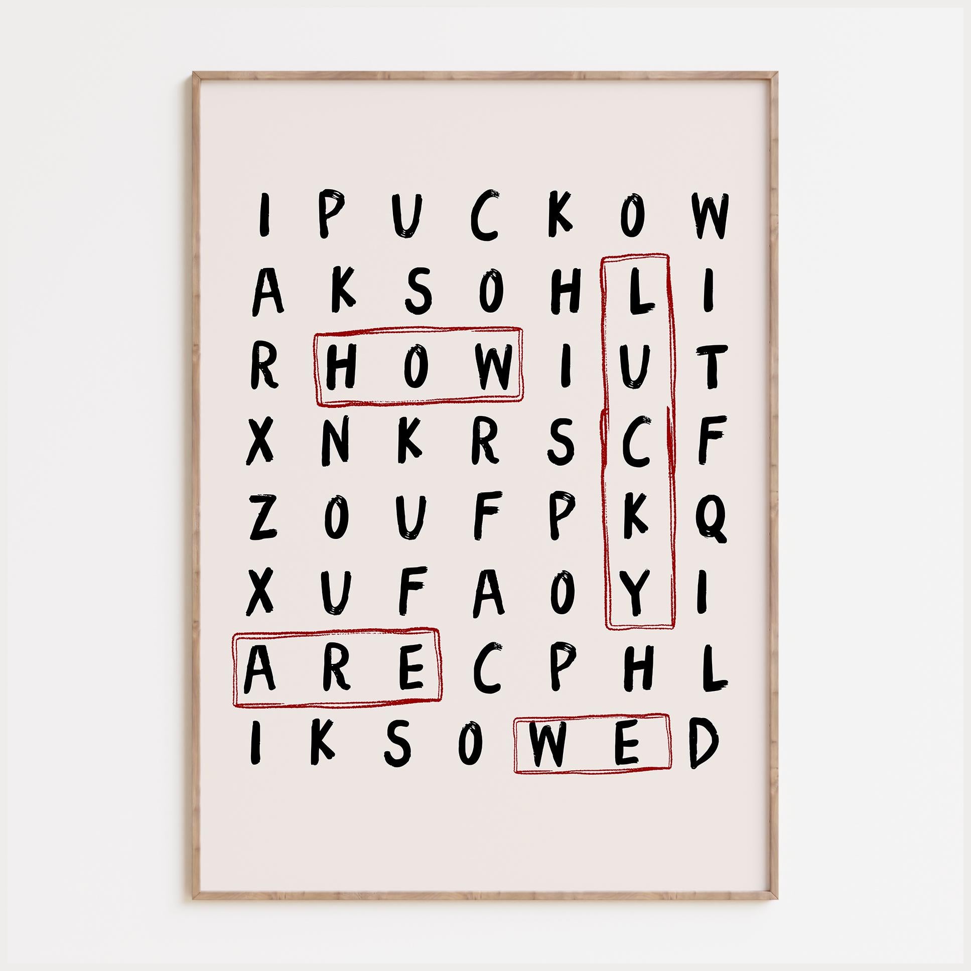 Quirky wordsearch style print with "How Lucky Are We" quote - the perfect print for your living room, bedroom, or apartment!