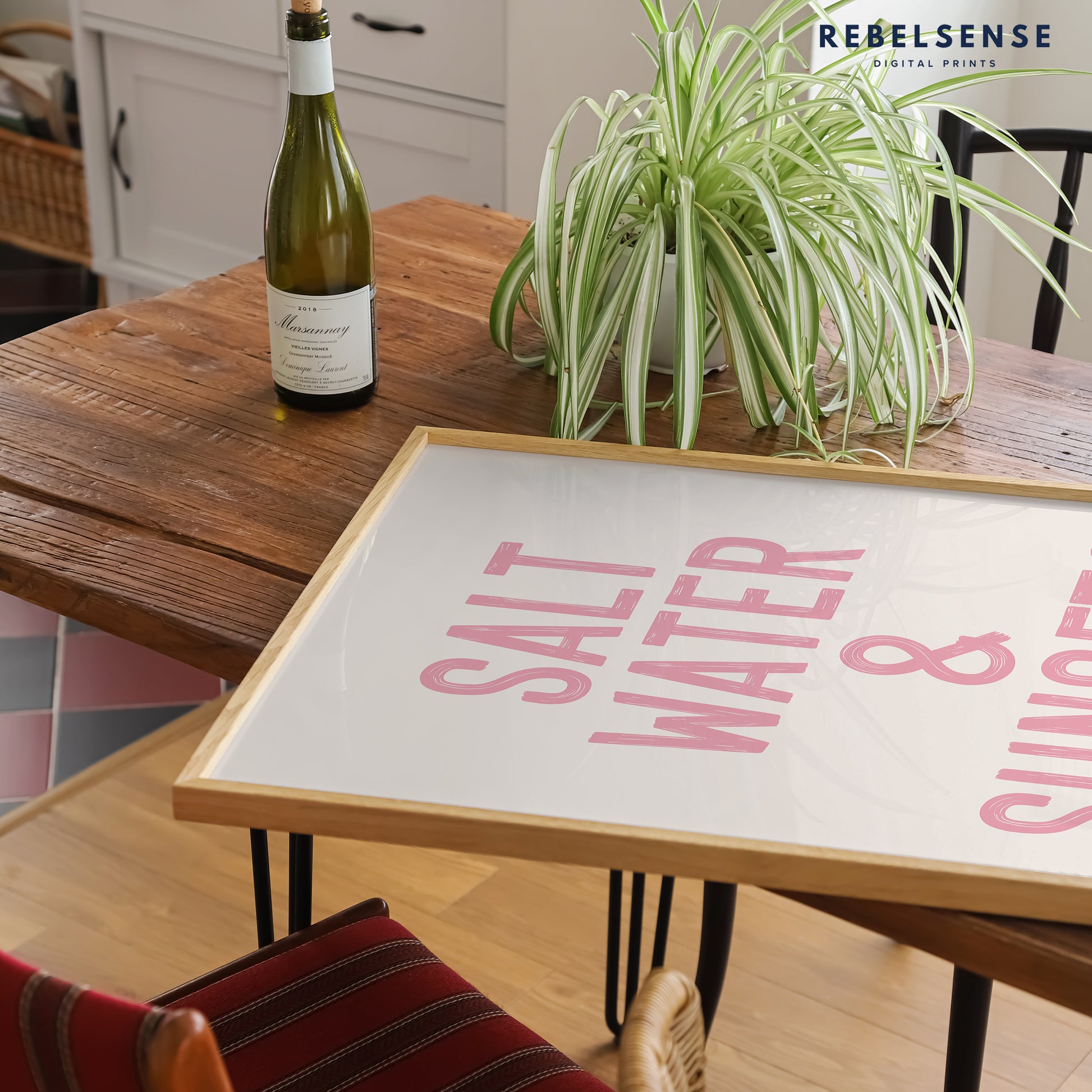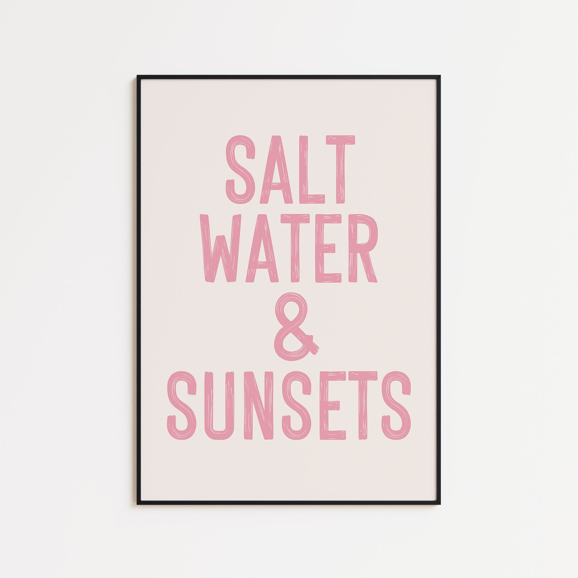 Light pink 'Saltwater & Sunsets' quote print with textured pink font
