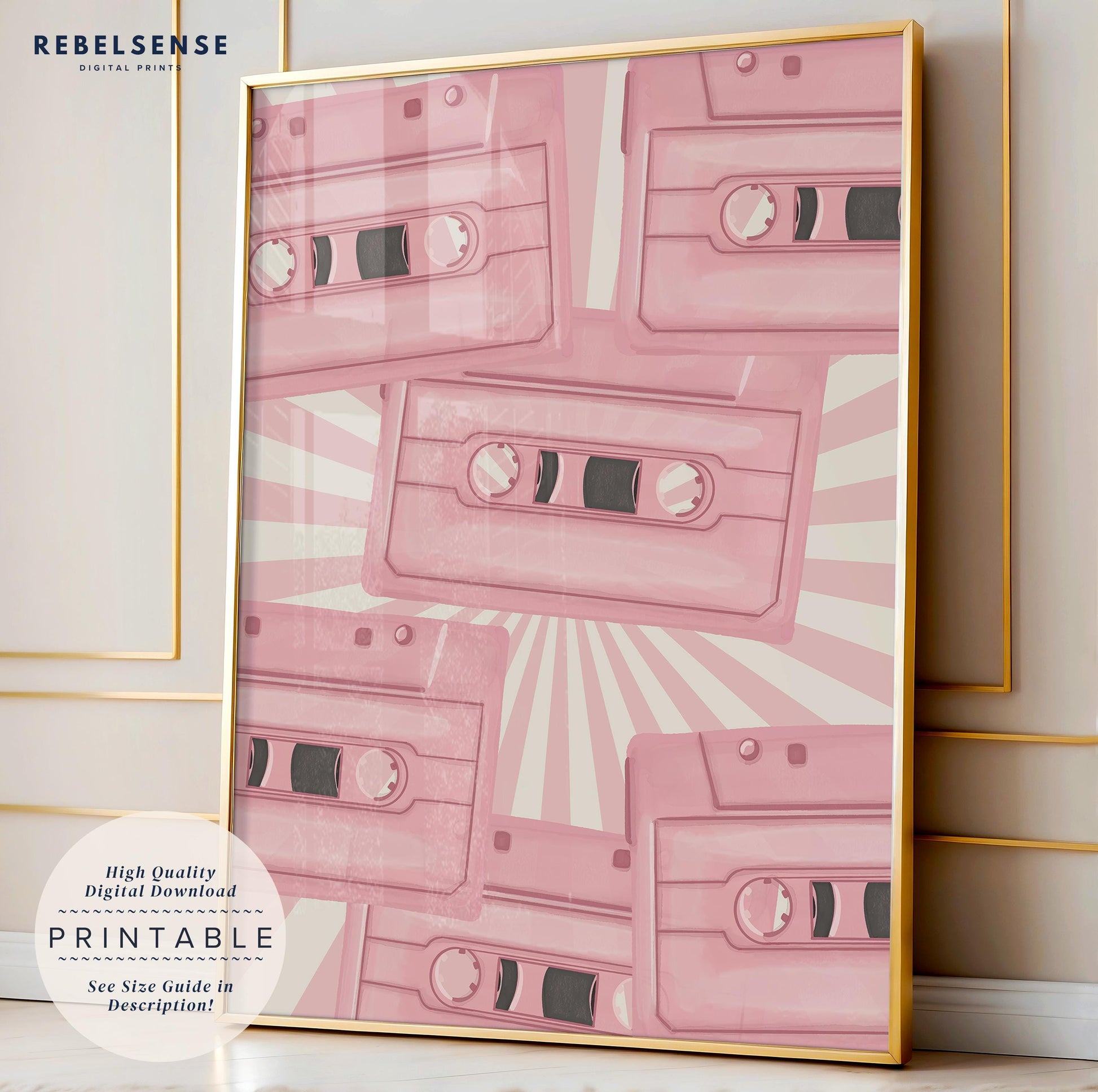 Pink hand drawn retro inspired cassette poster with funky background - perfect for apartments and dorms!