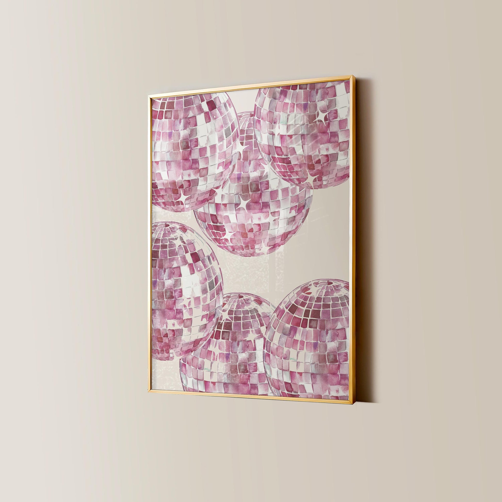 Soft beige print with overlapping pink disco balls in a watercolor style with shimmering highlights. This retro-inspired design looks great in creative spaces, bedrooms, and apartments!