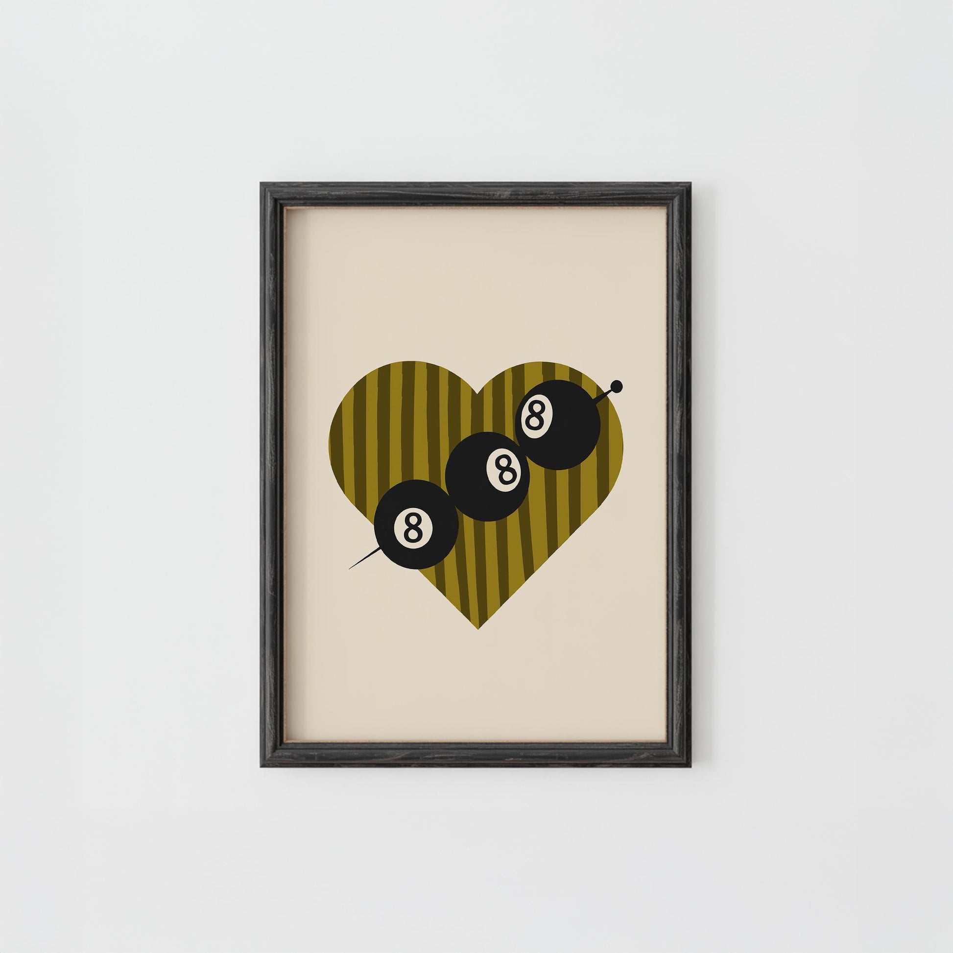 Quirky pool balls on a cocktail stick print with green striped heart background - the perfect print for your bedroom, living room or apartment!