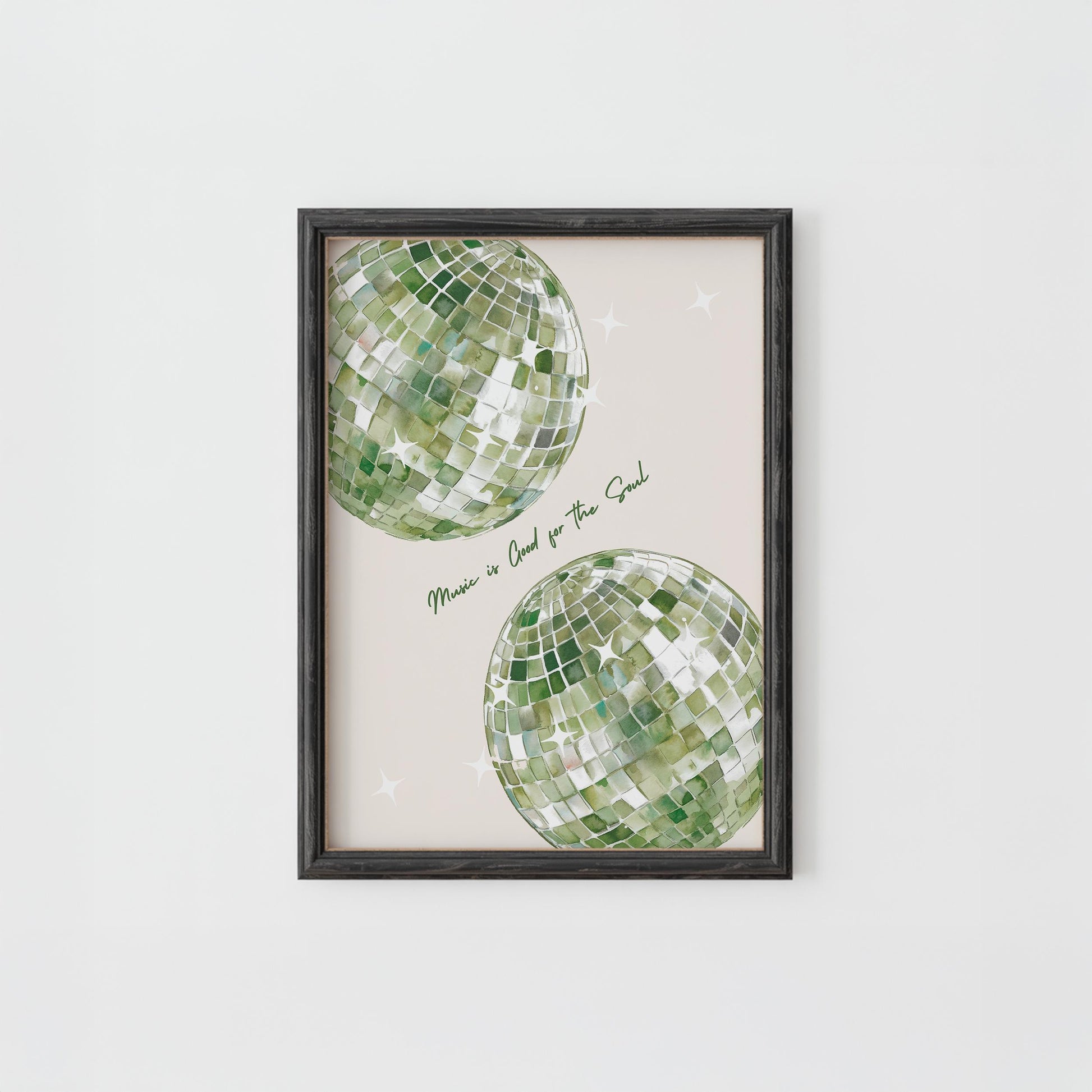 Funky watercolor-style sage green disco ball print with "Music is Good for the Soul" quote - the perfect print for your living room, bedroom, or apartment!