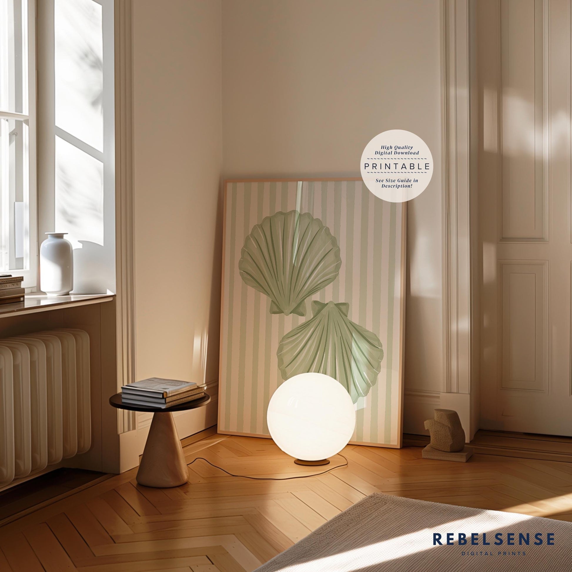 Hand drawn sage green seashells print with a light sage striped background - perfect for your beach house, apartment, or college dorm!