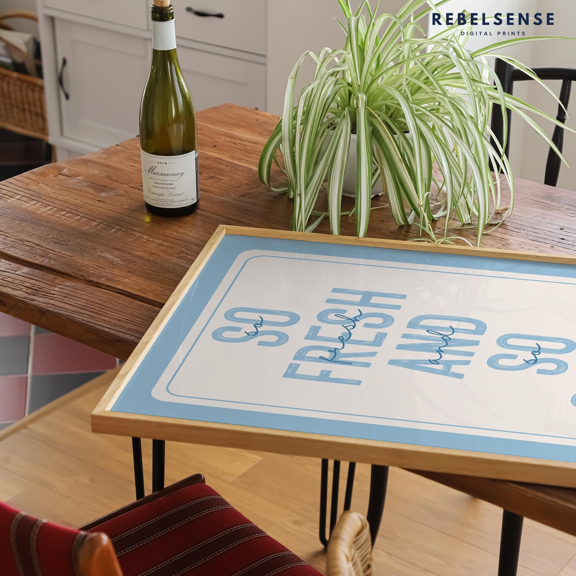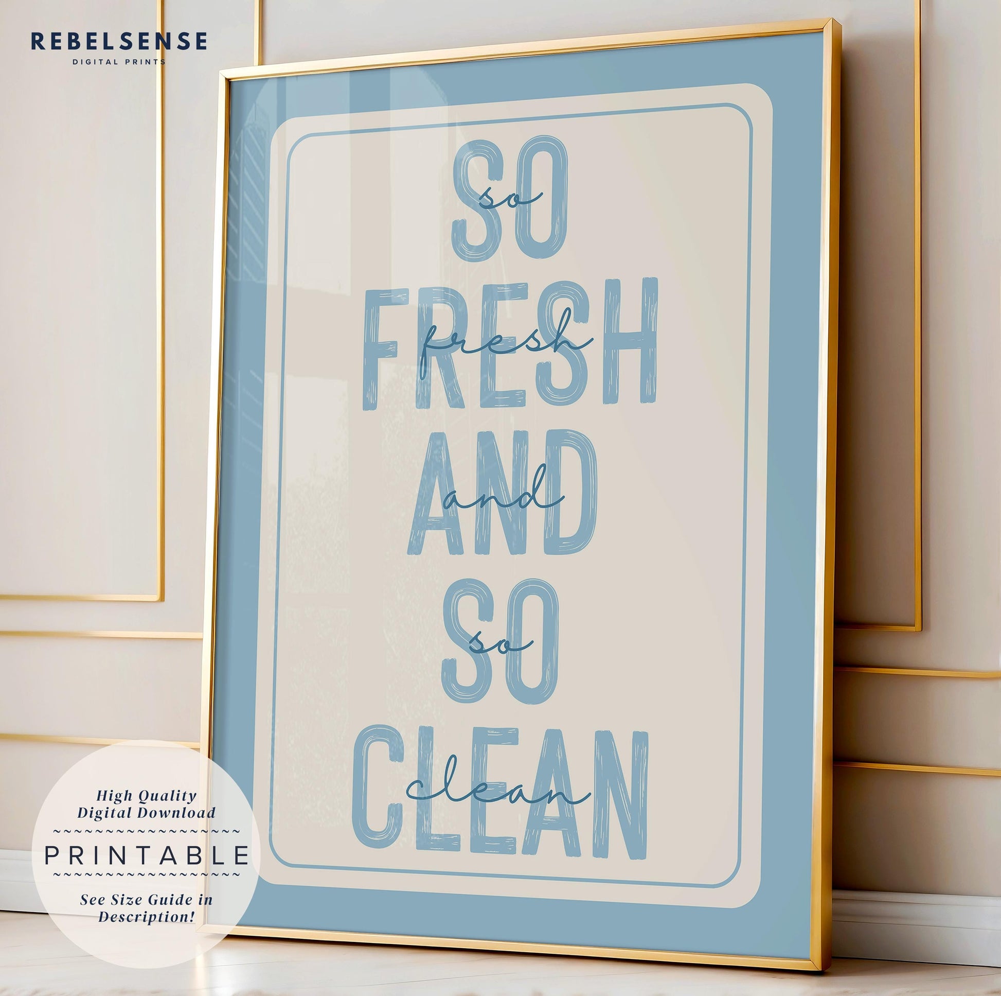 Light blue bathroom print with "So Fresh And So Clean" quote