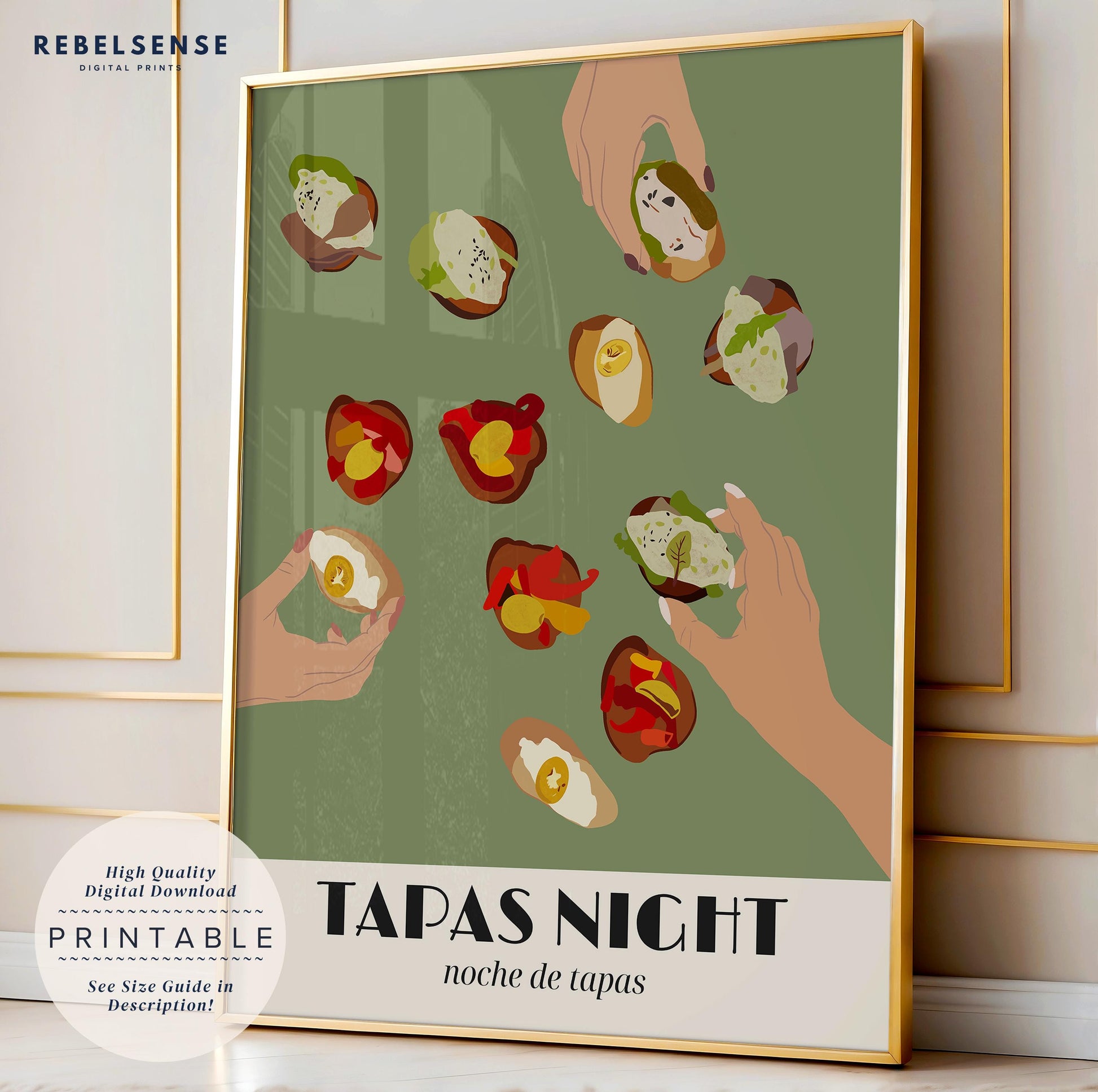 Spanish inspired hand drawn print featuring assorted tapas on a sage green background